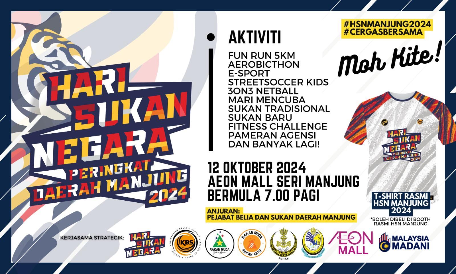 AEON MANJUNG AEON Seri Manjung, Pusat Perniagaan, Jalan Manjung Point 3, 32040 Seri Manjung, Perak, Seri Manjung, Perak, MalaysiaPENDAFTARAN FUN RUN HSN 2024 TELAH DIBUKA . Orang ramai dijemput untuk bersama-sama memeriahkan Program Ikonik Fun Run 5km Sempena Hari Sukan Negara Peringkat Daerah Manjung 2024 yang akan diadakan pada ketetapan yang berikut : 12 Oktober 2024 (Sabtu) Perkarangan AEON Mall Seri Manjung 7.00 pagi (Pendaftaran & Lapor Diri) . Ayuh kita menyahut cabaran...